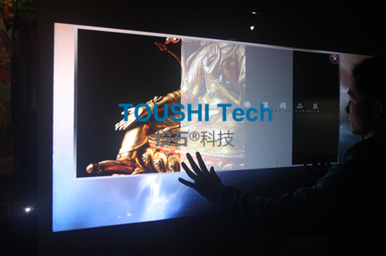 二:展品二,南京投石智能系統(tǒng)通過數(shù)碼櫥窗技術(shù),展示西藏佛教鍛造工藝技法,投石通過多點(diǎn)觸控來選擇性的了解鍛造工藝的工具,材料,技法。由于數(shù)碼櫥窗魔法膜可控的通透性,故可選擇性的改變其是通透性來觀察房間內(nèi)的展示品?;?a href=http://www.westyy.cn target=_blank class=infotextkey>數(shù)碼櫥窗設(shè)備可將圖像投射到博物館玻璃櫥窗的普通玻璃上,顧客在店外隔著玻璃點(diǎn)擊圖像畫面,在店內(nèi)的互動櫥窗設(shè)備可感應(yīng)到顧客手指的動作,并對手指位置進(jìn)行精確定位,控制圖像配合用戶的運(yùn)作進(jìn)行變換,實(shí)現(xiàn)用手指或其它自然物品在投影屏幕上的觸 摸選擇,打開界面、轉(zhuǎn)換畫面、信息查詢、拖動等控制功能,進(jìn)而使普通的玻璃櫥窗變成超大尺寸的互動廣告觸摸屏。互動數(shù)碼櫥窗又叫電子櫥窗、數(shù)字櫥窗、魔幻櫥窗、互動櫥窗、數(shù)碼櫥窗。