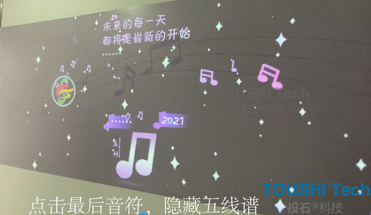當(dāng)體驗(yàn)者按下文化墻上音樂圖標(biāo),伴隨著音樂開啟五線譜便會有很多跳動的音符冒出。五線譜上顯示各個(gè)年份內(nèi)容。點(diǎn)擊年份,相繼跳出該年份的文化事跡。