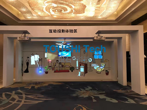 項目背景:2017年1月,南京投石智能系統(tǒng)成為美的環(huán)境電器墻面投影互動感應(yīng)裝置建設(shè)單位,該墻面互動裝置應(yīng)用于美的環(huán)境電器2017年經(jīng)銷商大會,默認(rèn)場景是靜態(tài)噴繪布,支持多人同時觸摸。