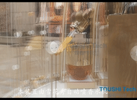 投石智能系統(tǒng)多機(jī)聯(lián)動(dòng)控制裝置被安置在上海新世界大丸百貨雪花秀時(shí)光鎖鮮艙限時(shí)快閃店門(mén)口。一個(gè)透明的半圓形櫥窗用于展示該品牌的香水產(chǎn)品。這套裝置只需要一鍵按下白色按鈕即可觸發(fā)三個(gè)裝置同時(shí)運(yùn)作,分別是自動(dòng)噴香水機(jī)、自動(dòng)吹海洋球裝置、燈光聯(lián)動(dòng)裝置。