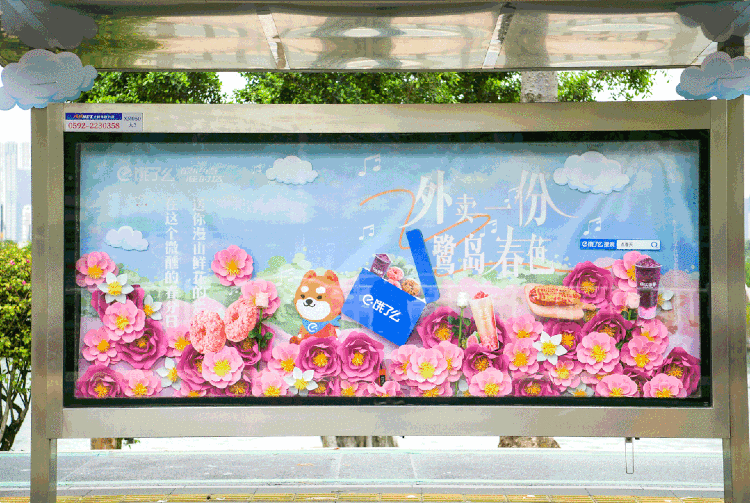 項目內(nèi)容:2022年3月-4月,廈門餓了么聯(lián)名多家本地知名品牌發(fā)起“外賣一份鷺島春色”活動,并在廈門環(huán)島路等多個地點打造春日創(chuàng)意公交站,分別是珍珠灣站、廣電中心站、BRT縣后站、廈大白城站,這些公交站不僅在裝飾上處處體現(xiàn)了鷺島春天的美,還特別在公交戶外櫥窗中放置了趣味互動裝置:人體感應(yīng)識別機械花開裝置。
