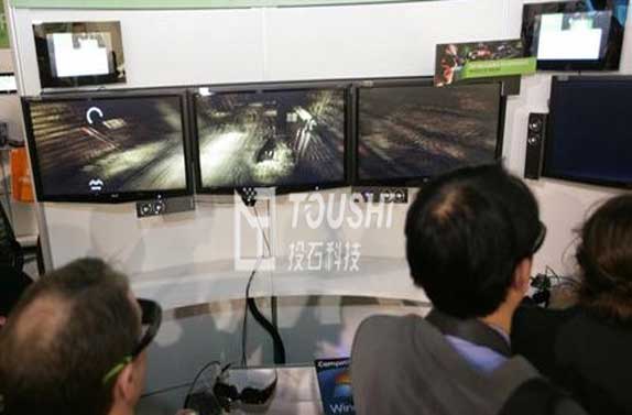 2012年5月,南京投石智能系統(tǒng)有限公司為某機構(gòu)實施了基于NVIDIA 3D Vision Surround的立體三屏技術(shù),用于軍事仿真展示用途。NV方案的兩大賣點是立體和環(huán)幕。簡單地說,該技術(shù)就是將3D Vision立體幻鏡技術(shù)擴展到三屏拼接環(huán)幕系統(tǒng)中。3D Vision立體技術(shù)是NVIDIA多屏方案相比AMD Eyefinity的一大優(yōu)勢。組建3D立體多屏(3D Vision Surround)系統(tǒng)需要三臺均支持3D Vision技術(shù)(120Hz)的液晶顯示器或投影儀,單個分辨率最高1920x1080; 3D Vision Surround技術(shù)支持邊框糾正功能,讓用戶可以全視角地體驗游戲。