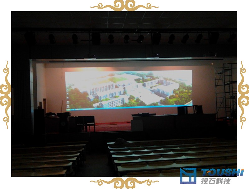 2012年2月8日,南京投石智能系統(tǒng)有限公司為淮安市盱眙二中大禮堂提提供了三通道桌面融合投影拼接,本項目采用三臺三洋XM1000C伍仟流明高流明投影機?,F(xiàn)場圖如下。
