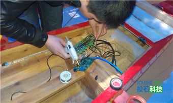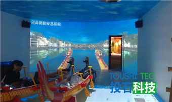 投石智能系統(tǒng)通過龍舟競渡虛擬仿真、踩螃蟹地面互動(dòng)投影系統(tǒng)、虛擬翻書、電子沙盤、觸摸屏等高科技互動(dòng)技術(shù),分別介紹南京市高淳縣旅游景點(diǎn)分布、交通、城市發(fā)展等方面的內(nèi)容。龍舟競渡虛擬仿真展項(xiàng)通過設(shè)置了2條龍舟,每條龍舟可同時(shí)乘坐4人,三維場景均根據(jù)高淳縣現(xiàn)場實(shí)景采集建模制作,借助于基于硬件的投石互動(dòng)傳感驅(qū)動(dòng)系統(tǒng),實(shí)現(xiàn)參與者劃動(dòng)船漿速度快、慢時(shí),弧幕畫面速度顯示實(shí)時(shí)變化。