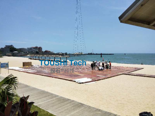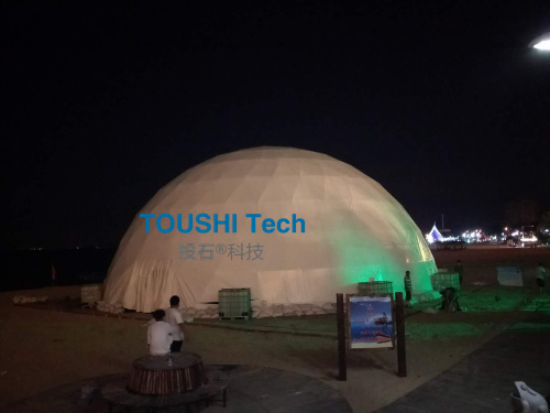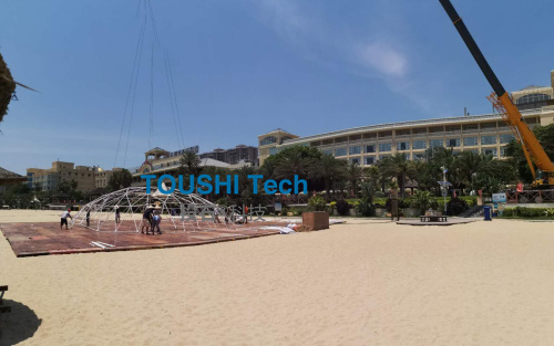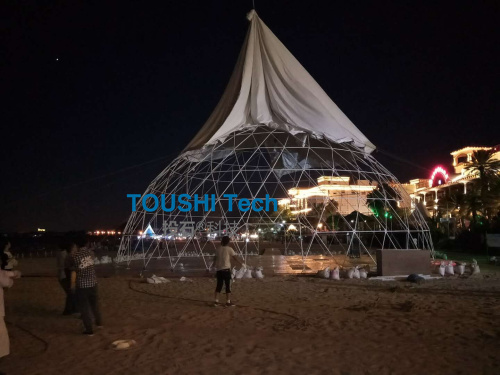 360戶外球幕球體主結(jié)構(gòu)采用合金鋼管標(biāo)準(zhǔn)件拼裝構(gòu)成,球體直徑20米,高9米的半球體采用PVC篷布里外覆蓋,所有材料均達(dá)到防火B(yǎng)1級(jí)標(biāo)準(zhǔn),設(shè)有兩個(gè)安全出入口,外層覆蓋幕布整體吊裝完成,球體鋼架現(xiàn)場(chǎng)拼裝,拼裝時(shí)間短,安全快捷,球體周邊有固定碼,即保證球體安全抗風(fēng)能力,又不影響原地面基層設(shè)施。