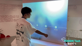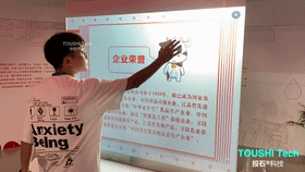 在展廳內(nèi),投石智能系統(tǒng)為“衛(wèi)崗,全新未來”主題提供了全息投影互動裝置,主要由65寸玻璃觸摸膜組成。內(nèi)容包含[品牌概述]-[品牌大事件]-[品牌歷史時間軸]-[品牌畫冊]四大塊。