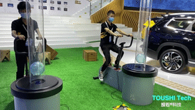 投石智能系統(tǒng)的這款騎車吹氣球裝置主要通過遙控器啟動,體驗者腳踩踏板開始騎車,通過前方的小球開始慢慢飄起,騎行速度越快,小球上升的速度也會越快,最終到達終點。此裝置可單獨騎行互動體驗,也可2臺一起競技比賽互動。