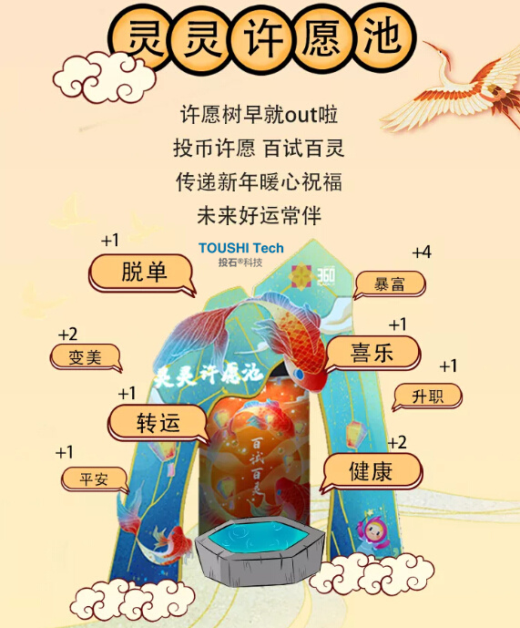 投石智能系統(tǒng)用科技手段配合線下體驗式互動模式,給大家?guī)砥嫒さ?a href="http://www.westyy.cn/products/6/" target="_blank">互動體驗和視覺沖擊!新田360廣場【鄭州國貿店】靈靈許愿池互動裝置,只要心中默念,許下心愿,將許愿幣投入水池中,轉運必備,百試百靈,傳遞新年暖心祝福,未來好運常伴,記得來打卡哦。