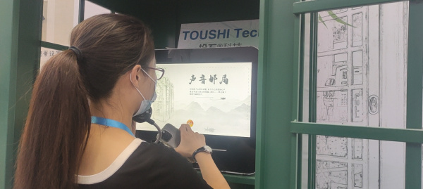 這塊白屏,看似平淡無(wú)奇,沒(méi)有任何畫(huà)面,無(wú)任何特別之處,可就當(dāng)體驗(yàn)者拿著魔法眼鏡裝置對(duì)著白屏,神奇的事情就會(huì)發(fā)生,鏡面照到的地方就會(huì)有神奇的動(dòng)態(tài)畫(huà)面出現(xiàn)。這是投石智能系統(tǒng)未來(lái)之眼魔法眼鏡裝置,其尺寸大小,顏色外觀造型皆可包裝定制。 圖:觀眾體驗(yàn)未來(lái)之眼魔法眼鏡裝置 在整個(gè)展會(huì)中,還有很多高科技產(chǎn)品,像投石這款體感粒子特色交互裝置,影隨我動(dòng),不同的風(fēng)格互動(dòng)起來(lái)的展現(xiàn)形式也是千變?nèi)f化。當(dāng)觀眾經(jīng)過(guò)這個(gè)裝置的時(shí)候,作品畫(huà)面上的水與墨粒子會(huì)隨著觀眾移動(dòng)的快慢、人數(shù)多少的感應(yīng)而產(chǎn)生流動(dòng)和變化,畫(huà)面也會(huì)變得更為有趣。 圖:觀眾體驗(yàn)數(shù)字化文博展示,體感粒子特色交互