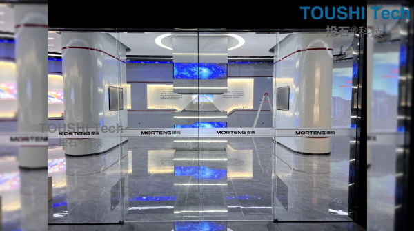 項目內(nèi)容:2022年11月,投石智能系統(tǒng)為安徽摩騰科技合肥工廠展廳項目提供全息柜,五通道弧形投影,展廳中控多媒體裝置。