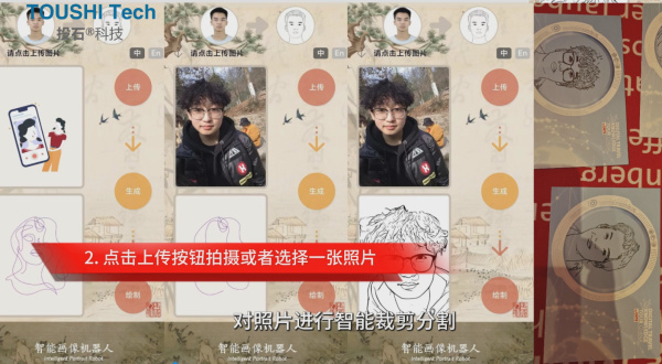 1.用戶掃描二維碼進(jìn)入小程序 2.點(diǎn)擊上傳按鈕拍攝或者選擇一張照片 3.點(diǎn)擊生成按鈕生成線條肖像畫 4.最后點(diǎn)擊繪制按鈕機(jī)器人開始繪畫 5.最終效果
