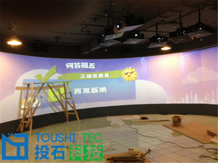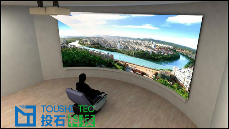 環(huán)幕投影和多通道融合校正是一種時下流行的大型顯示技術(shù),表現(xiàn)場景宏偉,氣勢磅礴。在環(huán)形或者各類弧形幕布上投影豐富多彩的多媒體內(nèi)容。在環(huán)形基礎(chǔ)上還可以加入觸控或者互動功能。投石可以提供120度,270度,360度等各類弧度的環(huán)幕。也可以定制不規(guī)則環(huán)形。