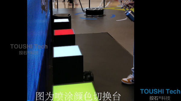 投石智能系統(tǒng)凌空噴漆涂鴉互動裝置中關(guān)于顏色取色換色有兩種模式,一是在顯示屏幕里,預制多個虛擬顏料桶,體驗者凌空選擇顏色更換取色,二是實物顏料桶選擇顏色更換取色。