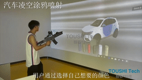 南京車管所榮威汽車凌空噴漆涂鴉互動裝置案例中顏色取色換色是體驗者拿著模型槍對著屏幕里進行虛擬取色更換。