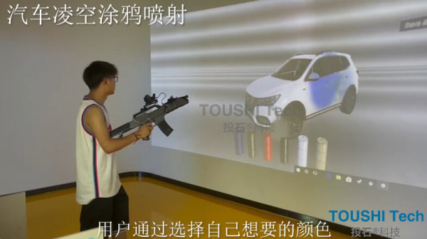 2、體驗者拿起噴槍靠近油漆桶模型射擊進行取色;或者對著大屏幕進行虛擬取色更換;