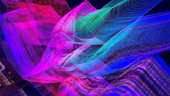 2017年,美國藝術(shù)家珍妮特·艾克曼(Janet Echelman)在北京藍(lán)色港灣帶來了名為《1.8》的作品。通過藝術(shù)與技術(shù)的結(jié)合,以彩色網(wǎng)狀結(jié)構(gòu)在空中搭建巨大的漂浮作品。