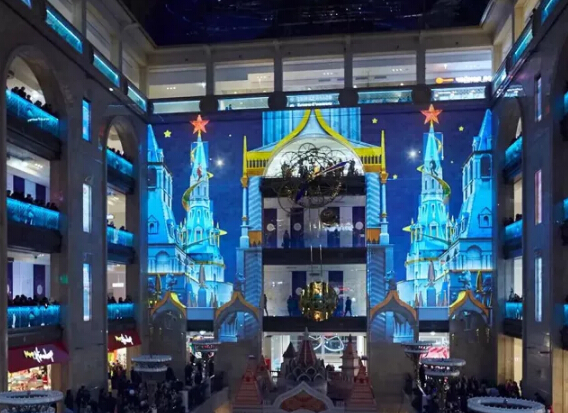俄羅斯莫斯科中央兒童購物中心有著世界上極大的永久性3D交互投影,將建筑與3D投影技術(shù)融為一體,內(nèi)容豐富的動畫影像遍布整個商場,眼前呈現(xiàn)的,不僅僅是一個巨大的投影設(shè)置,而是一整個動畫王國。
