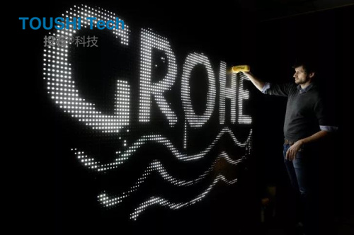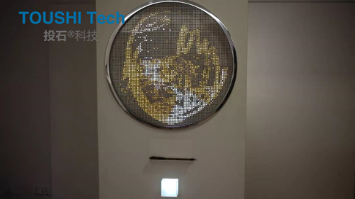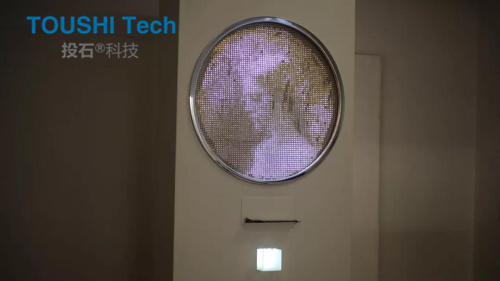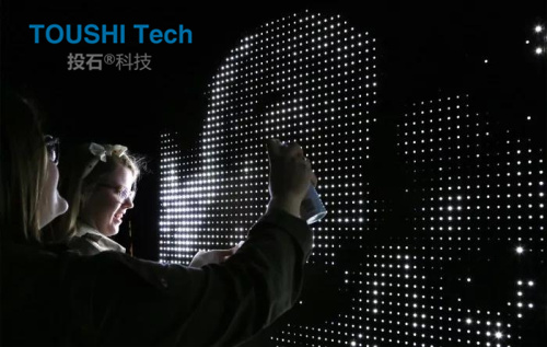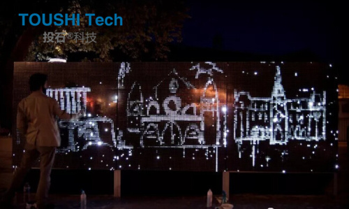 投石智能系統(tǒng)“水光涂鴉”是由成千上萬的LED燈組成的墻壁。將被磨平的LED燈珠焊接在PCB板上,組成一個大型的LED燈墻,設(shè)置好靈敏的傳感器,LED燈珠接觸到濕度信息后而變得光亮。公共設(shè)施可以用畫筆,水槍,手指或任何潮濕的東西操縱,以嵌入生動的數(shù)字信息。這件作品形成了一個交互式的公共城市空間,在視覺上傳達(dá)短暫的信息而不會惡化。