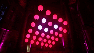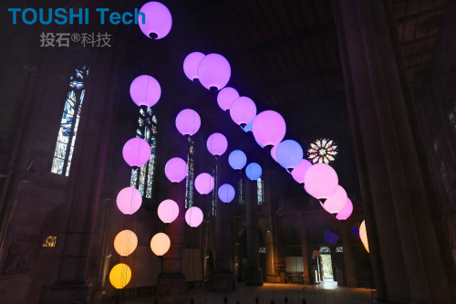 看似失重的氦氣球伴隨著音樂,有規(guī)律地在空中舞動,以極富詩意的方式照亮了整個空間,將斯圖加特雄偉的圣瑪利亞教堂變成了一個藝術舞臺。