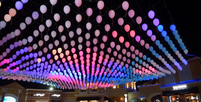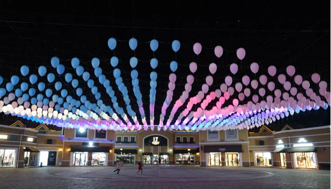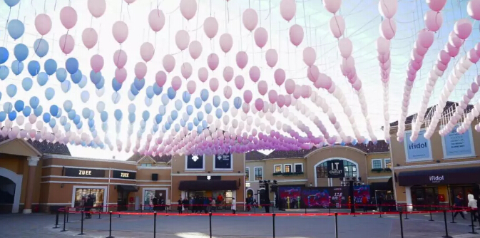 這款唯美的氣球名叫「回音氣球」,是為北京斯普瑞斯奧特萊斯定制的藝術裝置,在一個30米直徑的大圓空間里,899個PE材質的定制氣球懸掛在6米高的空中,每個氣球懸掛高矮不一,形成了一種波浪曲線的效果。