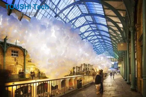 2015年倫敦設計節(jié),法國藝術家及攝影師CharlesPétillion推出的一個巨大的燈光云的裝置作品,命名為“心跳”「Heartbeat」。該作品是由10萬個白色氦氣球懸掛而成的一個積云狀的燈光裝置作品,形成一個巨大的人工云層,懸掛在考文特花園南館,填滿了整個室內天花板。