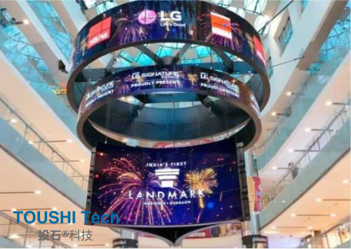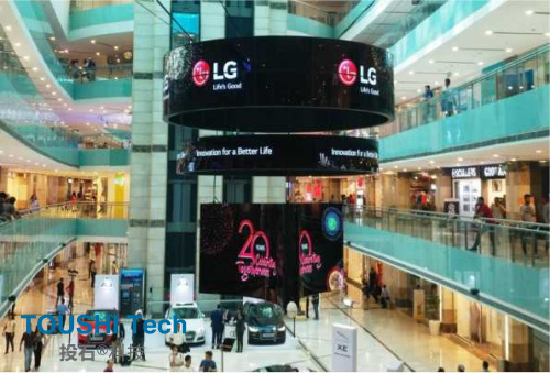 位于印度古爾岡的Ambience Mall購物中心,整體設(shè)計造型采用了70塊55EF5C開放型曲面OLED顯示器,組合成造型感十足的巨型八爪魚顯示器,擁有?股強大的力量將四面八面的顧客抓獲過來,凝聚?起,沉浸于OLED的觀賞和消費的樂趣。