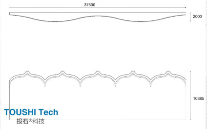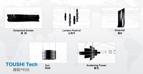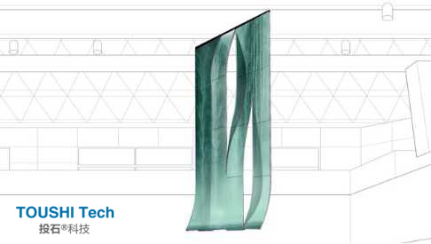 屏風,由多組隔扇組成可以折疊的活動隔斷,起到分隔、美化、擋風、協(xié)調(diào)等作用。曲線OLED被堆疊在4個?同水平的動態(tài)流線型曲線上,如中國傳統(tǒng)的折疊屏風。象征著一種中國博?大精深的文化。