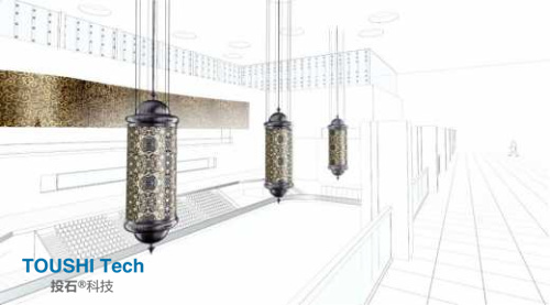 迪拜人信仰伊斯蘭教,來源于宗教信仰的設(shè)計靈感也無處?在。在迪拜滑冰場上所構(gòu)想圓柱形吊燈恰巧源自于傳統(tǒng)的阿拉伯燈,由OLED曲面屏組裝成的圓柱形吊燈,四周布滿了?伊斯蘭教圖案。