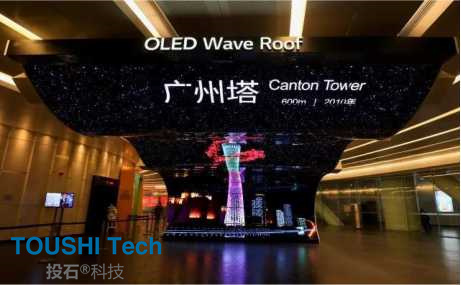 走進廣州塔一層登塔大廳,一組波浪型超級大屏呈現(xiàn)在游客面前,它就是“OLED波浪穹頂(OLED Wave Roof)”,由75張形態(tài)各異的OLED面板拼接而成的波浪型超級大屏。“OLED波浪穹頂”的外觀設(shè)計流暢優(yōu)美:從地面開始,通過?同的弧度的卷曲,一直延伸至屋頂。搭配體感裝置、極具視覺沖擊力的短片,給予游客強烈視覺沖擊的頂級享受。