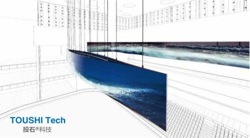 在迪拜大型滑冰場上,設(shè)計者充分利用他們引以為豪的海岸線和三角帆船元素。在館內(nèi)上空的正中央擬設(shè)計了一艘由OLED曲面屏拼成的巨大的三角帆船,貼壁鋪設(shè)了一幅模擬超長海岸線的OLED波浪型曲面屏,將迪拜迷人的沿海風光真實還原。