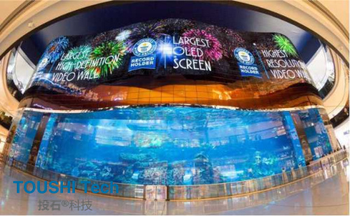 Dubai mall推出的超大的屏幕,創(chuàng)下三個吉尼斯世界紀錄:世界最大的OLED屏幕,世界最高分辨率的大屏幕和世界最大的高清視頻墻。