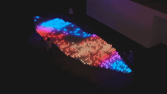裝置主體由1300個水滴形狀感應(yīng)式燈組成,排列成波浪起伏的表面。當(dāng)參與者用發(fā)光的物體靠近其中一顆“水滴”時,它會立即被點亮,并將這一點光傳遞給周圍的“水滴”。一道看得見的“光波”隨之一直延展到裝置的邊緣,如同你在湖水中投入一粒石子引起的漣漪。