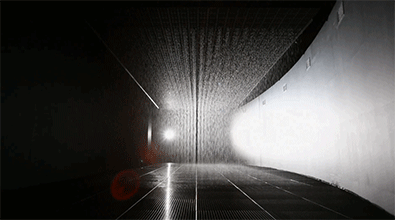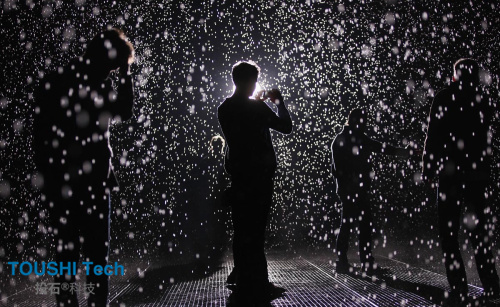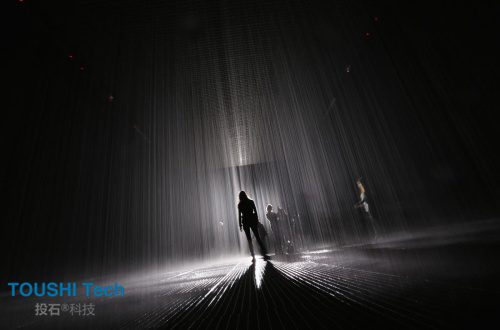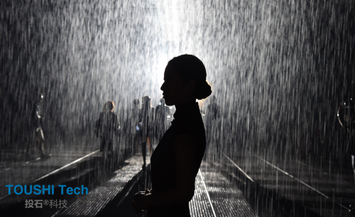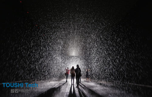 以數(shù)字三維和計算機3D感應(yīng)技術(shù)為基礎(chǔ),雨屋在對自然致敬的同時,通過人與機器的互動,讓“下雨”這個凡常的自然現(xiàn)象,擁有了一種超現(xiàn)實的色彩。而這也是一種別樣的方式,讓你在雨落和雨停、雨水在場與不在場之間,真切地感受到“身體”的存在。