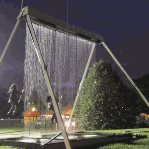秋千上方裝有監(jiān)測器,能夠捕捉蕩秋千之人的特征、速度等信息,計算水的降落時機,既營造了獨特的空間,又不會淋濕,非常有趣。
