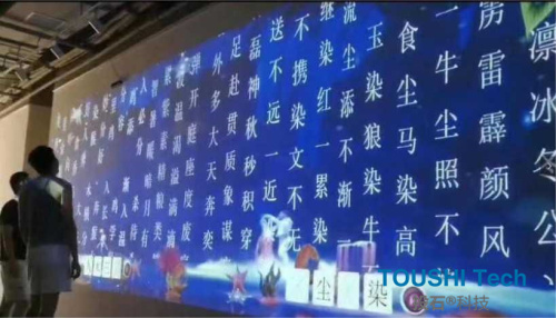 將漢字與成語(yǔ)文化,通過(guò)游戲的形式展示出來(lái)。參與者通過(guò)與投影畫(huà)面互動(dòng),將分散的漢字零件拼湊起來(lái),將飄落的文字組成正確的成語(yǔ)。這就是投石AR互動(dòng)成語(yǔ)墻。