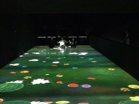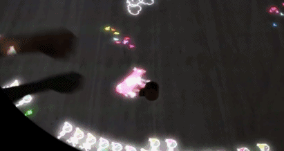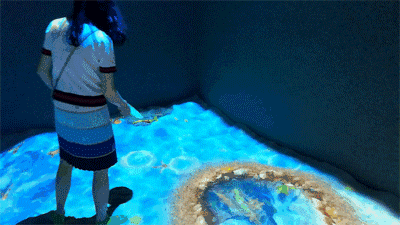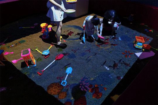 由一塊長方形顯示器和投影組成的動態(tài)地面。投影儀將圓圈、三角形、正方形等符號投影在地面上。孩子們跳落在這些形狀的符號上時就會發(fā)出聲音,并出現(xiàn)不同的顏色。
