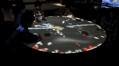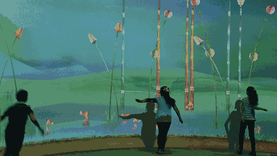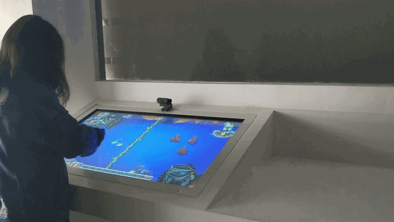 一款由互動桌涂色卡、彩筆、掃描儀、投影墻組成的兒童繪畫交互多媒體裝置。墻面將投射海洋的畫面,孩子們可以使用入的涂色卡上色。繪畫作品完成后,通過掃描儀識別,或者觸摸屏甩屏,小朋友們能夠看到自己創(chuàng)作的小動物出現(xiàn)在墻面投影世界中。此外,小朋友們還能與自己完成的繪畫作品中的動物進行有趣的互動。