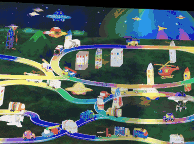 現(xiàn)場有彩色蠟筆和需要填色的各種房子、汽車、飛機的形狀,每個人根據(jù)自己的喜好填好顏色后,在3D掃描儀上一掃,你創(chuàng)作的房子、汽車和飛機就變成立體的出現(xiàn)在巨大的熒幕上,高架路上汽車會開上開下,拿手去碰一碰它會跳躍著和你打招呼,這個城市隨著越來越多人的創(chuàng)作變得越來越繁忙。