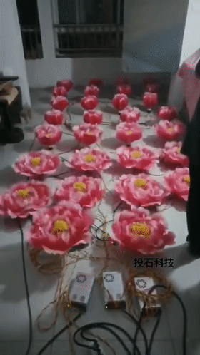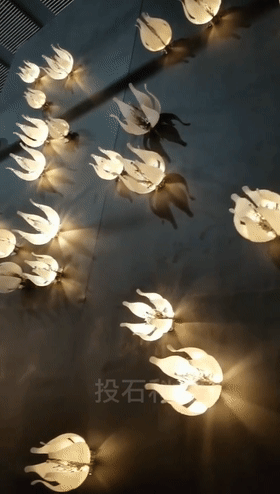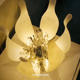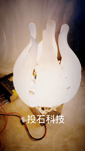 花瓣由6片葉子組成,隨著后臺控制慢慢的展開,花蕊里的燈慢慢亮起來。當花瓣閉合后,花蕊里面的燈又熄滅。循環(huán)往復。投石的花燈開花直徑:55cm。