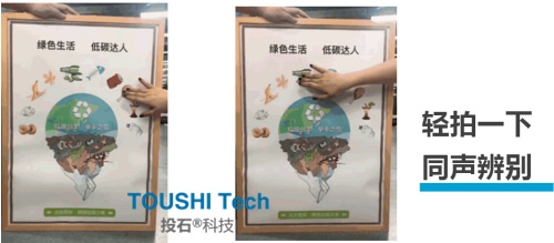 投石智能系統(tǒng)趣味垃圾分類畫框采用智能觸控技術(shù),使開發(fā)板能實現(xiàn)觸碰不同位置播放不同音頻的功能。