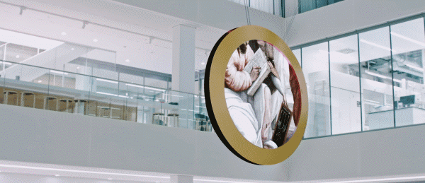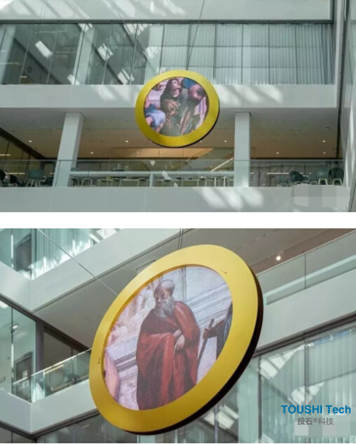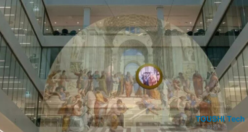 作品被設(shè)計(jì)成鐘擺的形狀,懸掛在大廳上空,以每秒0.7米的速度在空中移動(dòng)。在移動(dòng)的過程中不斷呈現(xiàn)出隱藏的拉斐爾壁畫《雅典學(xué)院》中的21位人物,仿佛一面“藝術(shù)魔鏡”展現(xiàn)著一張“看不見”的巨型畫作。
