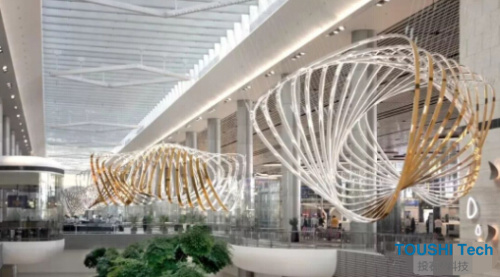 新加坡樟宜機(jī)場(chǎng)1號(hào)航站樓有兩組“雨之舞”藝術(shù)品,每組各長(zhǎng)9.8米,寬4米,兩組共有1,216顆形狀如水滴的青銅雕塑,可變換出16種不同的舞姿。