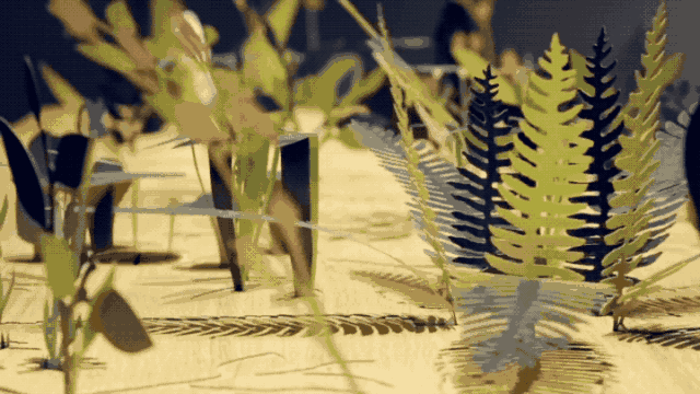害羞植物裝置由一張橡木桌子和兩面鏡子組成,裝飾著葉子,花朵和昆蟲,根據(jù)游客的行為出現(xiàn)或消失。當人們在附近時,桌子上的樹葉和昆蟲會緩緩向桌面貼合,但是一旦它們移開就會升起。