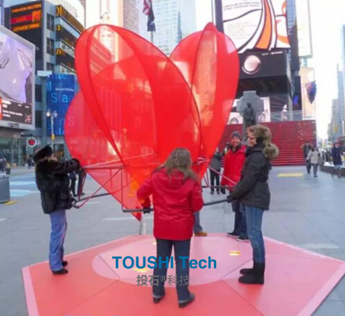 這款透明的立方體發(fā)光雕塑裝置,它高3米,由400根透明的亞克力管內嵌led燈形成一個在風中搖曳跳動的紅心,當人們觸摸心形雕塑一旁的傳感器,心就會變得更亮,就像心臟一樣跳動。