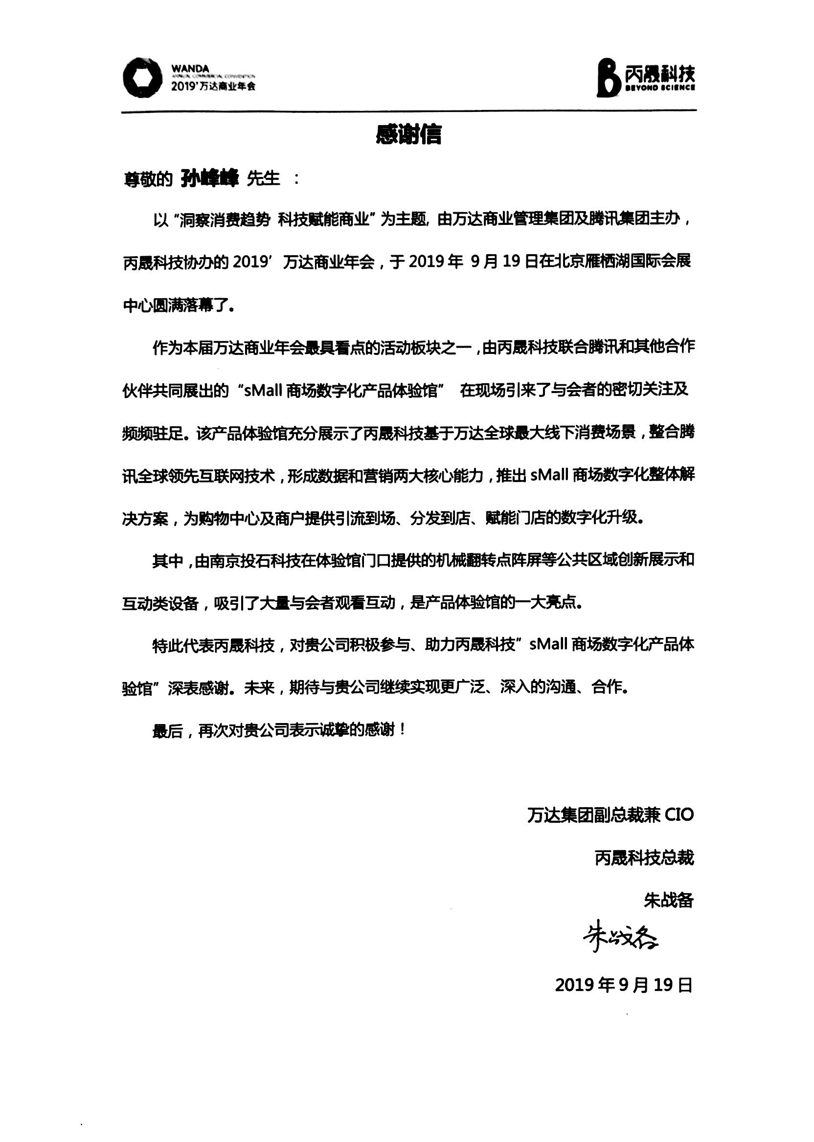 2019萬達商業(yè)年會感謝信