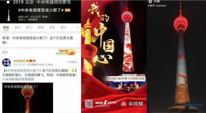 2019年國慶節(jié)中央廣播電視塔燈光秀破2億微博閱讀量:中央電視塔變成火箭了。 《“國慶70周年”戶外視覺錯位裝置》