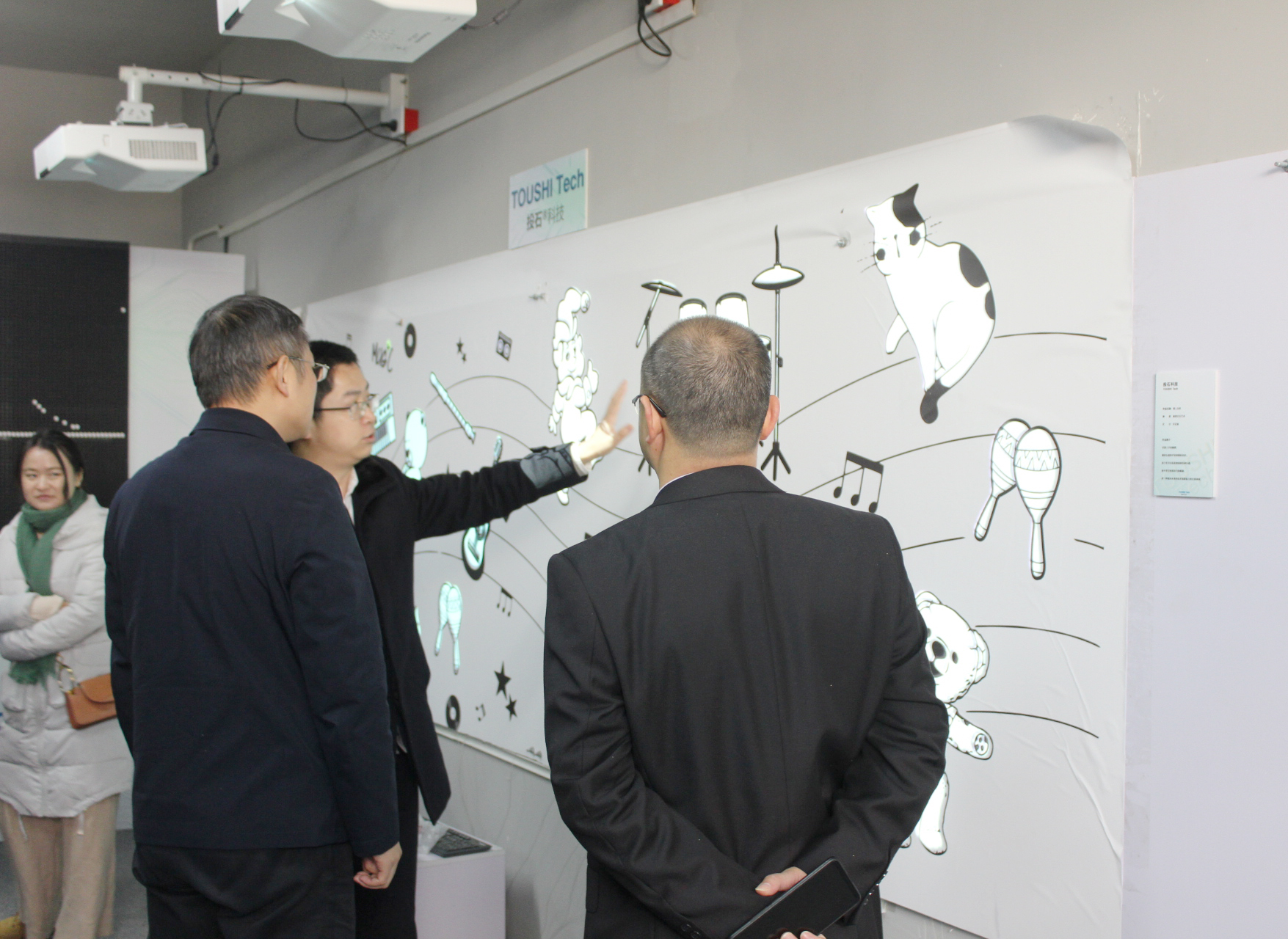 孫峰峰總經(jīng)理向來訪嘉賓介紹了公司的未來之眼魔法眼鏡、魔法音樂觸摸墻、聲音郵局、企鵝矩陣、投幣式花燈、任意門、體感二次元、風(fēng)動(dòng)羽紗等展項(xiàng)。