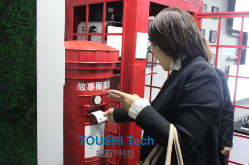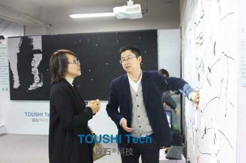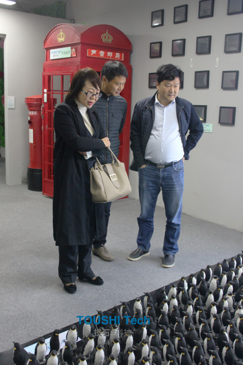 孫峰峰總經理向來訪嘉賓介紹了公司的故事販賣機、花傘、未來之眼魔法眼鏡、魔法音樂觸摸墻、聲音郵局、企鵝矩陣、體感二次元等展項。