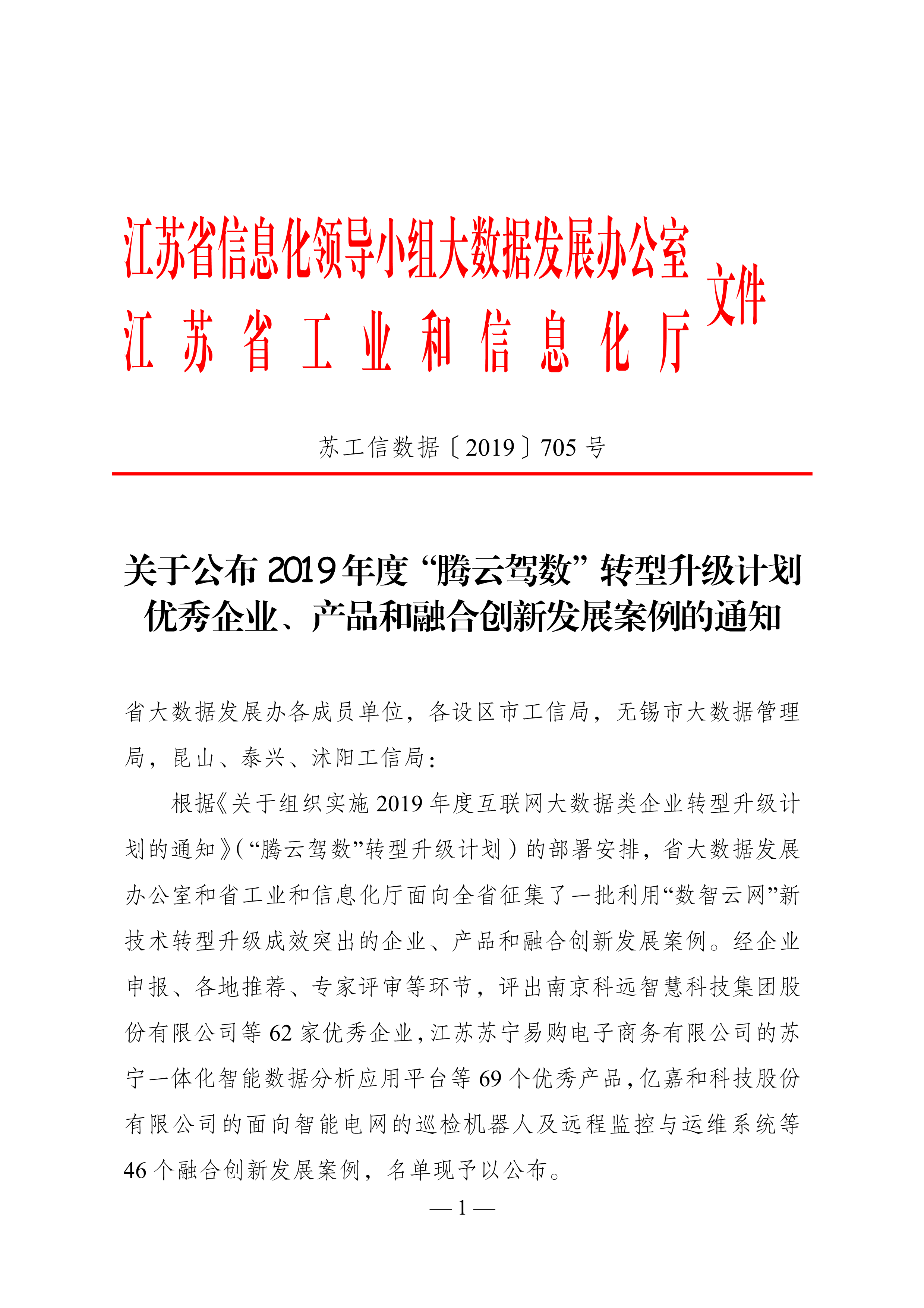 蘇工信數(shù)據(jù)〔2019〕705號,根據(jù)《關(guān)于組織實施2019年度互聯(lián)網(wǎng)大數(shù)據(jù)類企業(yè)轉(zhuǎn)型升級計劃的通知》(“騰云駕數(shù)”轉(zhuǎn)型升級計劃)的部署安排,省大數(shù)據(jù)發(fā)展辦公室和省工業(yè)和信息化廳面向全省征集了一批利用“數(shù)智云網(wǎng)”新技術(shù)轉(zhuǎn)型升級成效突出的企業(yè)、產(chǎn)品和融合創(chuàng)新發(fā)展案例。經(jīng)企業(yè)申報、各地推薦、專家評審等環(huán)節(jié),評出南京科遠(yuǎn)智慧科技集團(tuán)股份有限公司等62家優(yōu)秀企業(yè),江蘇蘇寧易購電子商務(wù)有限公司的蘇寧一體化智能數(shù)據(jù)分析應(yīng)用平臺等69個優(yōu)秀產(chǎn)品,億嘉和科技股份有限公司的面向智能電網(wǎng)的巡檢機器人及遠(yuǎn)程監(jiān)控與運維系統(tǒng)等46個融合創(chuàng)新發(fā)展案例,其中南京投石智能系統(tǒng)有限公司沉浸式互動體驗空間案例榮獲2019年度“騰云駕數(shù)”融合創(chuàng)新發(fā)展案例。