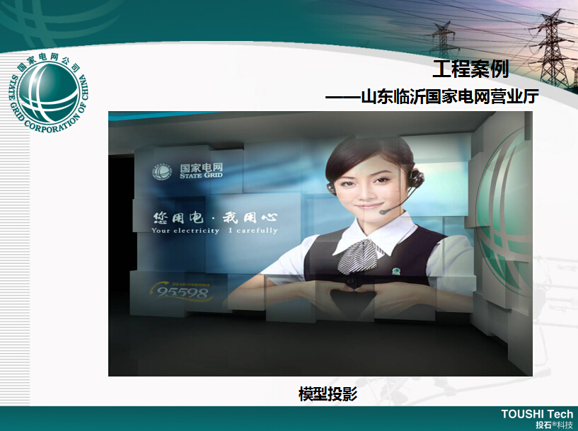 該工程的建設(shè)重點(diǎn)通過投石智能系統(tǒng)多媒體投影、智能中控、3D Mapping等展示技術(shù),結(jié)合企業(yè)內(nèi)部文化、智能電網(wǎng)、電力服務(wù)等內(nèi)容,打造全新的新時代互動型智慧電力營業(yè)廳。本次建設(shè)內(nèi)容包括營業(yè)廳裝修、智能中控、智能家居、智能樓宇、模型投影3D Mapping、液晶墻等多媒體設(shè)備和軟件系統(tǒng)。